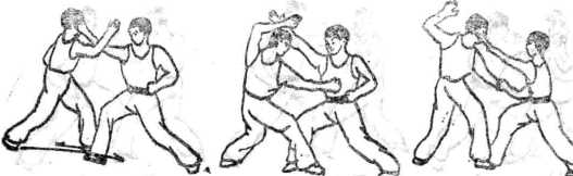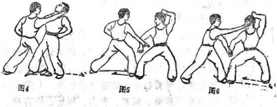注意:坐身、拧胯、化拳,必须迅速、及时、圆活。上 步、例颈,必须迅猛、有力,同时。此招的特点是用力舞伤 对方颈动脉,以能使对方血闭、气停。