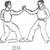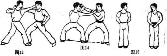 甲、乙双方都企图以左手握住对方右腕,拉回小腹处, 以右拳往下猛击对方右腕部。双方右手都从对方左手中脱出 ,右足退回一步并拢。同时右拳各击于自己左掌心内(图15 )O