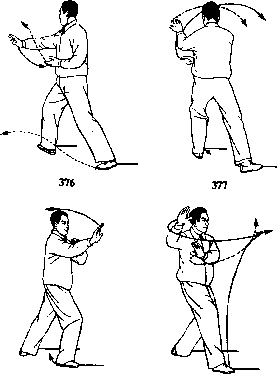 前迈出一步,成左弓步;同时,左手(手心转向上) 经左腰侦U自右手腕上穿出,高与眼平,指尖斜向上; 右手则落于左时下,手心向下;眼看左手(图376、