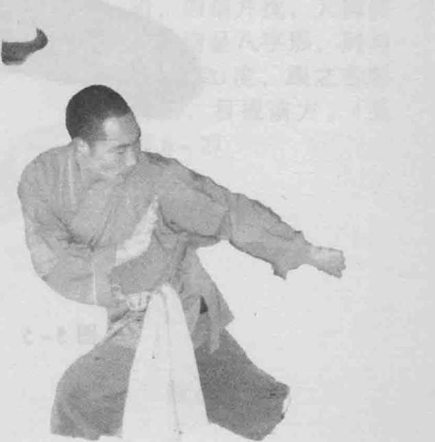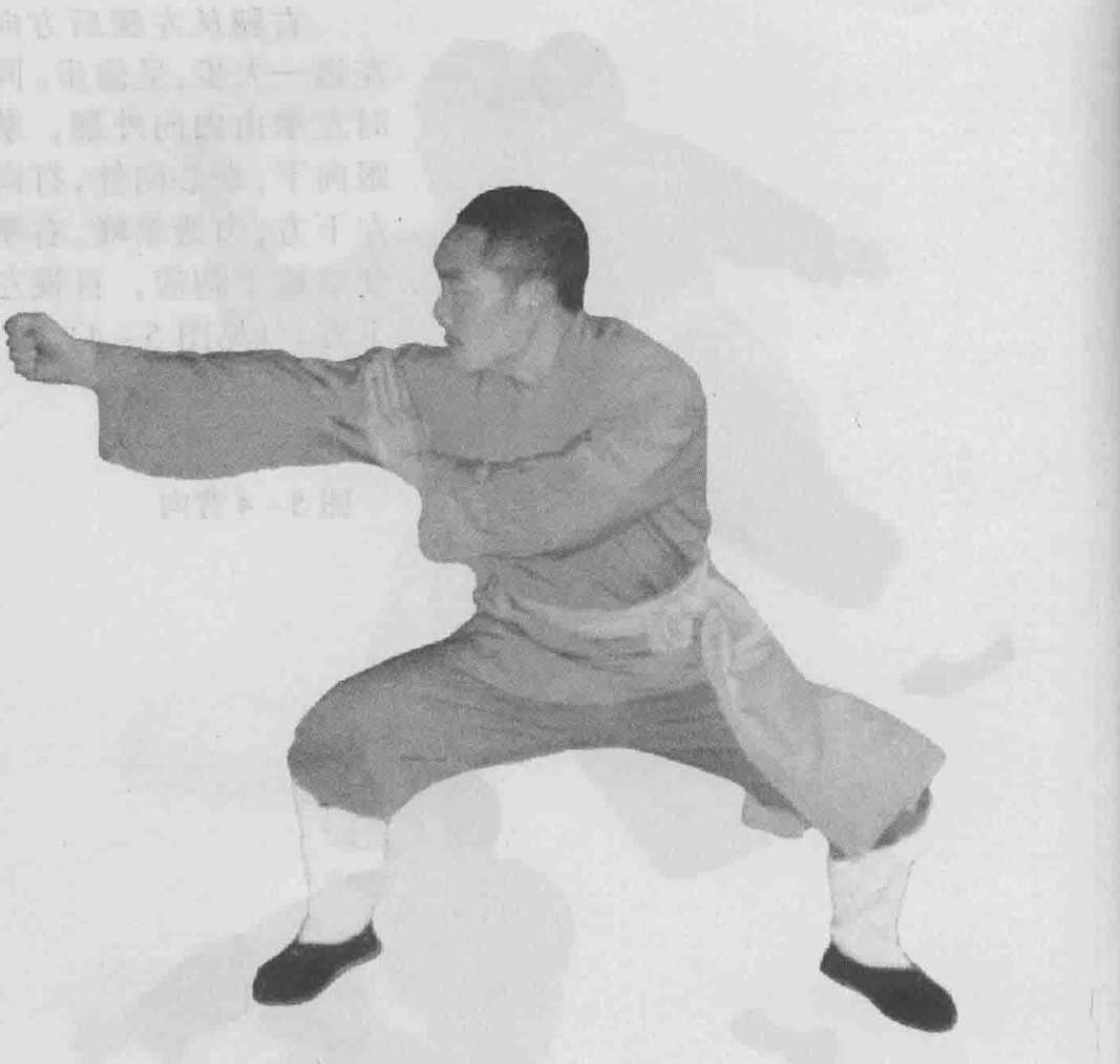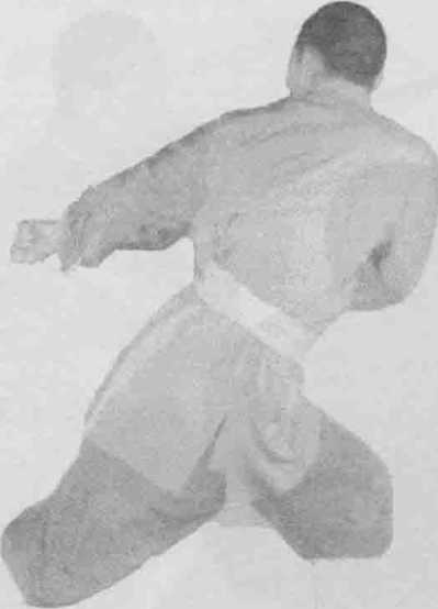 图5-4?向图5-4?向图5-4背向图5-4背向右腿从左腿后方向 左迈一大步,呈偷步。同 时左拳由内向外翻,拳 眼向下,拳心向外,打向 左下方,力透拳峰,右拳 变掌放于胸前,目视左 下方。(见图5-4)