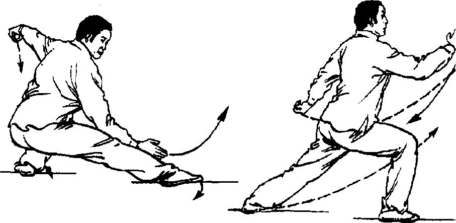②左腿全蹲,右腿铺直,上体右转,成右仆 步;右掌下落经腹前顺右腿内侧向右穿出,掌心 由内转向外,指尖向右;目视右掌(图27②)。