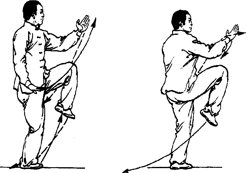 ② 重心前移,上体右转,左腿屈膝向前上提 起,脚尖下垂,右腿微屈站稳,成右独立步;左 勾手变掌,经体侧向前、向上挑起,成侧立掌, 指尖高与眉齐,右掌翻转下按于右胯旁;目视左 掌(图28②)。