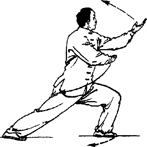 ① 重心右移,上体右转,右脚尖外展,左脚尖 内扣,右腿屈弓,左腿自然蹬直;右掌向上挑至体 前,成侧立掌,腕高与肩平,左臂内旋下落至身后, 勾尖向上;目视右掌(图28①)。