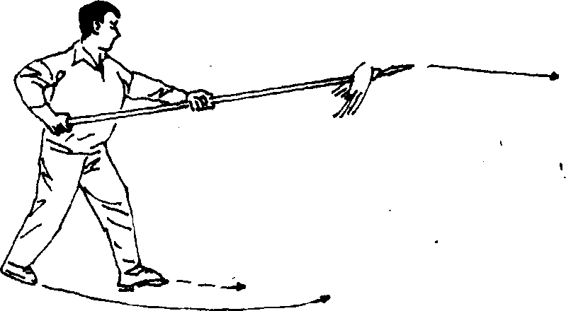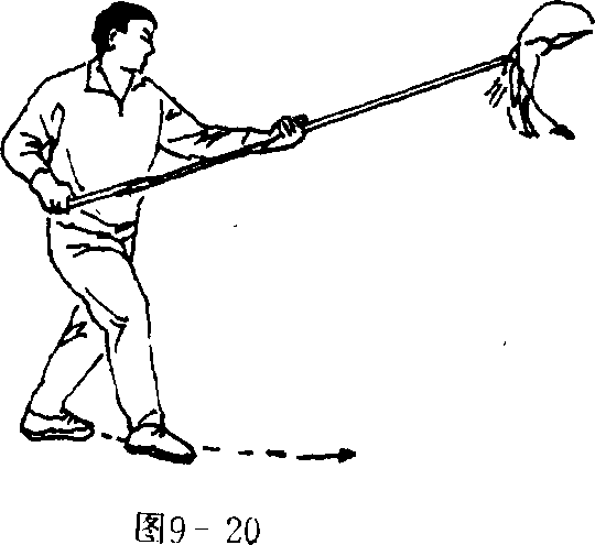 (二)接上动,左脚向右斜前上一步,脚尖外摆;同时,双手 持枪将枪尖向右内侧画弧拿拨,左手持枪手心内旋斜向下;目 视枪尖(图9-21). .