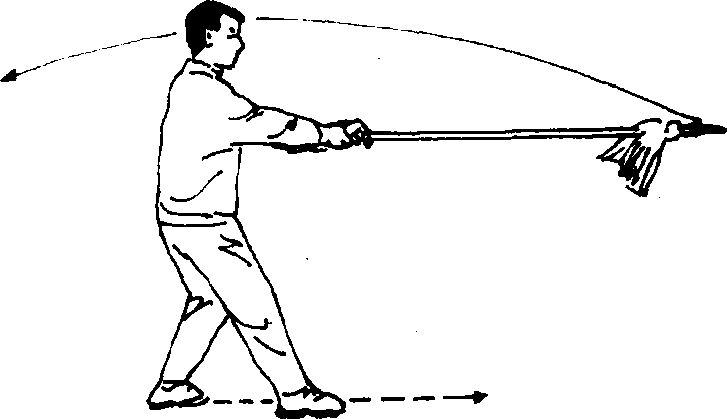 (三)接上动,右脚向左斜前方上一步;左脚随之跟进成顺 三体式步;同时,上体向左拧转;右手持枪向前扎出至碰左手, 枪尖高与肩平;目视枪尖(图9 —22)。