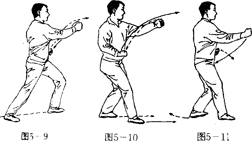接上势,右脚向前上一步,脚微内旋使脚尖向前;左脚蹬 地后随之跟进成顺三体式步;同时;上体向左拧转,左拳略下 落并屈肘回收至脐部左侧,拳心向上;右拳小臂略外旋,在左 拳下落时,经左拳上方向前击出,至拳眼向上,高与肋平;目视 右拳(图5-11)0要 点:右脚上步要远,右拳与右脚要同时到位,刚劲有 力。