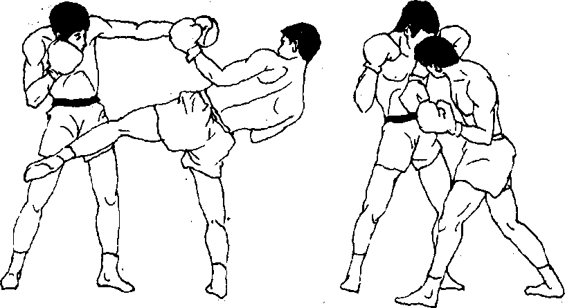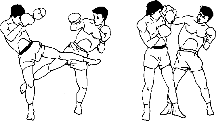 (6)在虚假动作掩护下,进步移位,以前冲力带动左腿低 割踢对方前腿膝关节、小腿肌肉,如果对方迅速后退步躲过, 落左步时,即以右脚猛蹬对方胸肋部(图13*135)。或用右脚