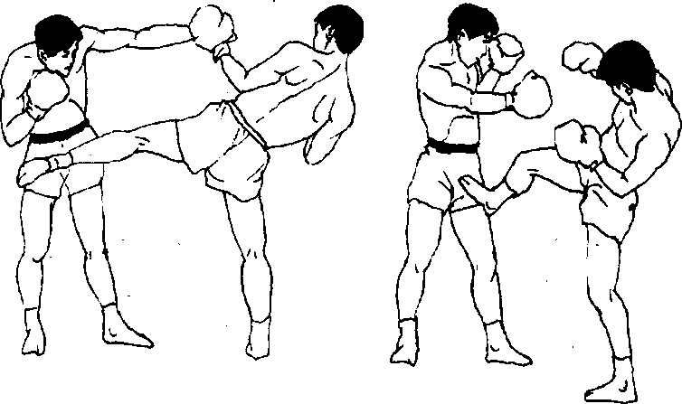 (5)如敌方发腿猛踢而至时,我方即侧身切进以右脚低割 踢敌方重心腿,落右步同时,挥动右鞭拳重击敌方面部(图 132、133)。
