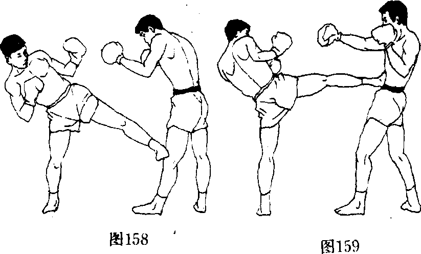 (1)前垫步以左脚铲踢对方前腿膝部,落步同时向左侧急 转身,用右脚踹踢对方中盘要害部位(图158、159r