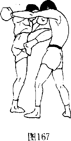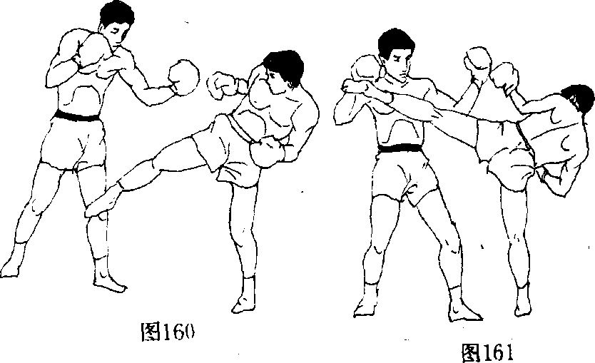 (2)突然以右脚铲踢对方前腿胫骨,落右步时,即用左脚 横扫踢对方颈项、胸膛(图160,161).