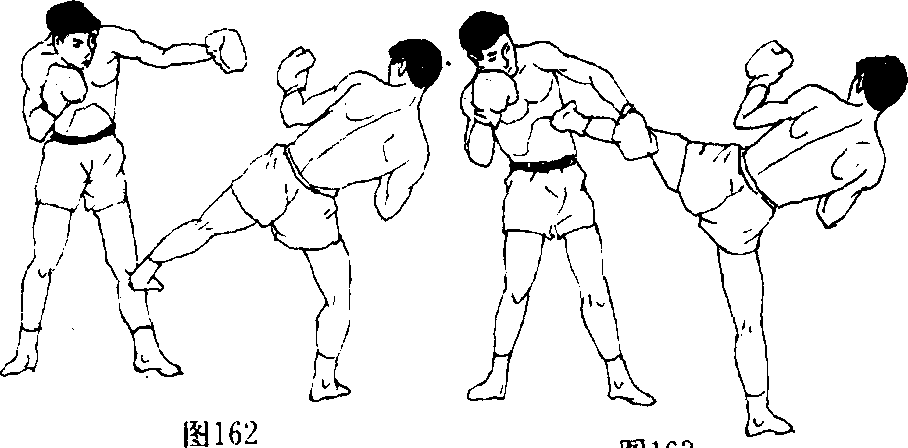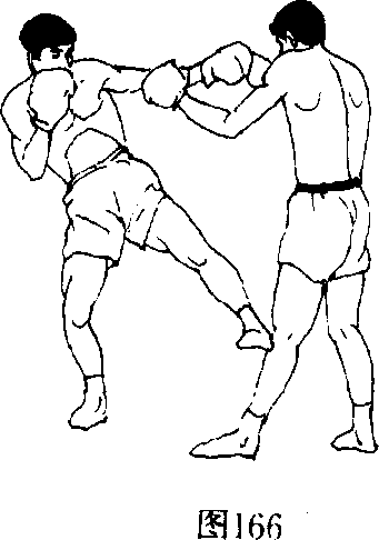 (3)挥肘佯攻,同时垫步左脚铲踢对方前腿,踢中目标后, 左腿迅速上抬侧踹对方心窝、肋腰部(图162、163)。
