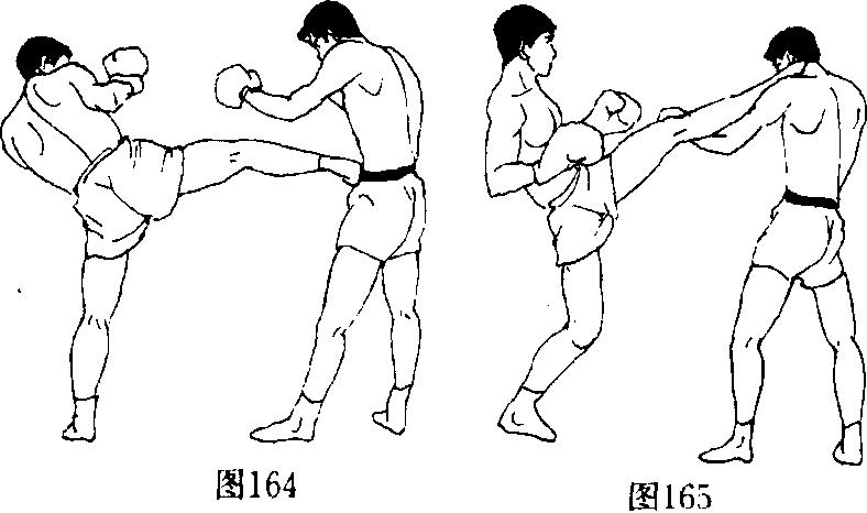 (4)先轻发边路扫踢吸引敌方注意力,随即以右脚铲踢敌 腰腹部,落右步进,即用左脚猛蹬其头部、肩膀(图164,165) 0