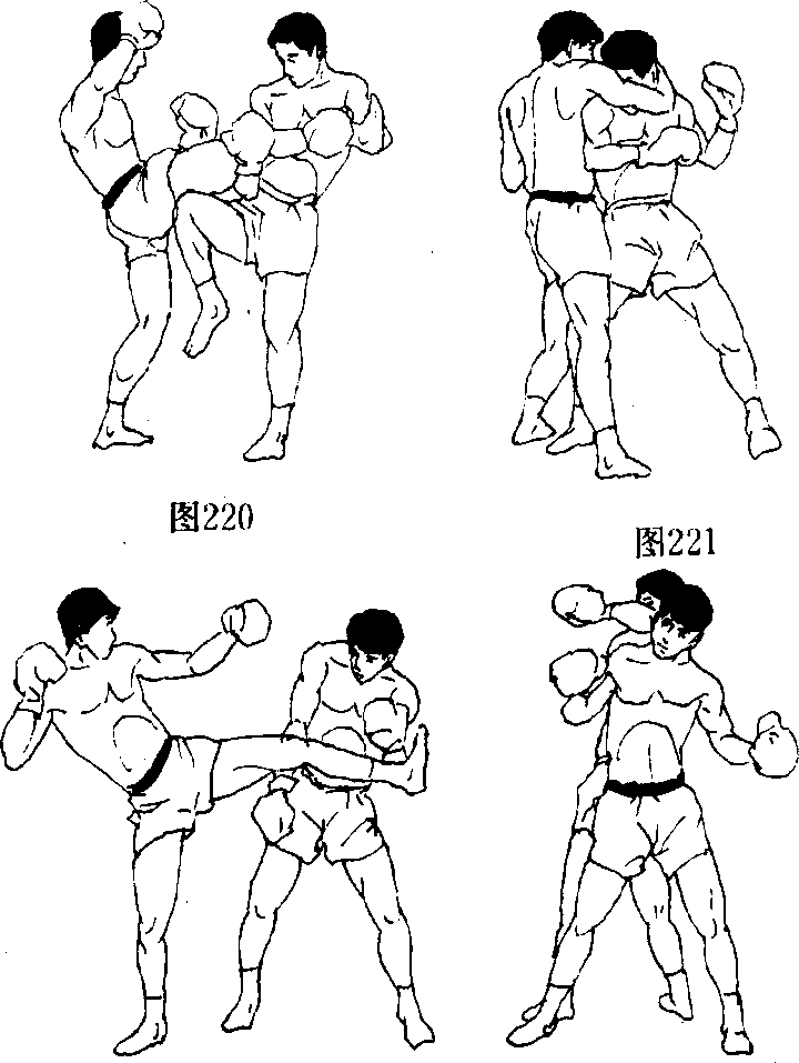随即用右脚猛蹬我方中盘时, 我右脚速上步并左转体,以双手锁抱对方攻击腿,以右短膝撞 击其囚腿根部,再继以右击肘攻击对方心窝、胃部(图220、 221)。