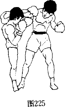 (9)对方以右脚猛蹬我方腰胯部、大腿根时,我即以左手 向外拨开,同时发右前冲膝撞击对方胸腹部,落右脚时,再继 左侧膝攻击其肋腰部(图224、225)。