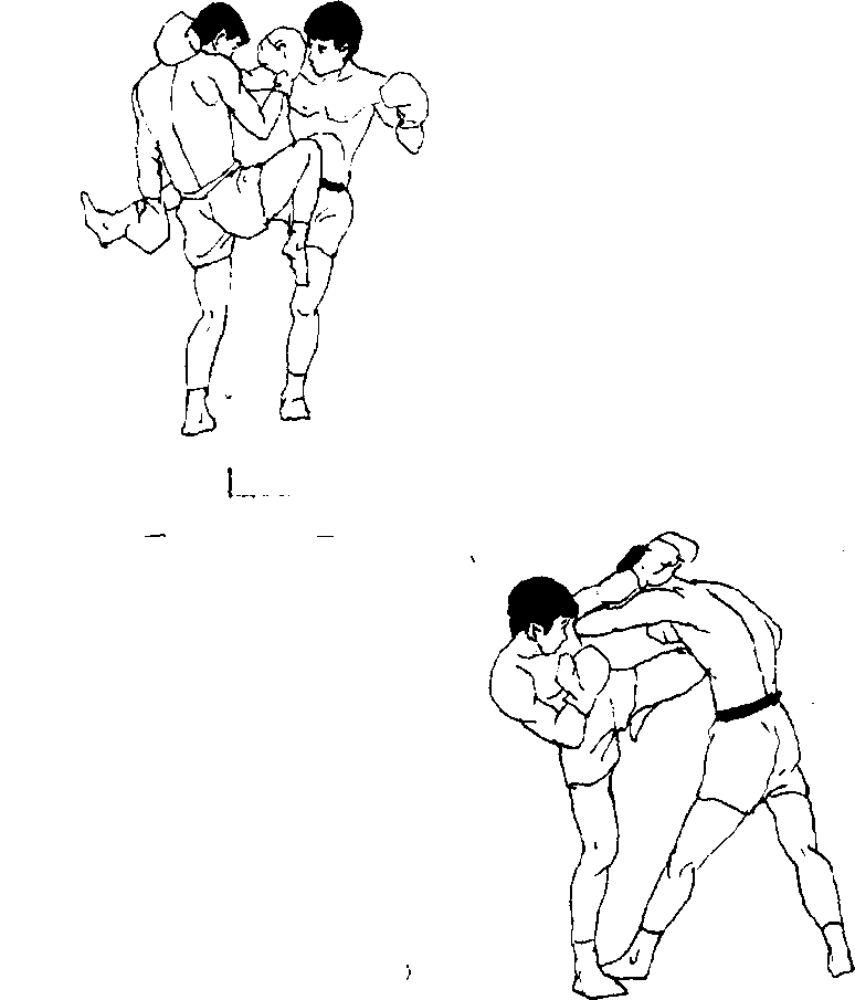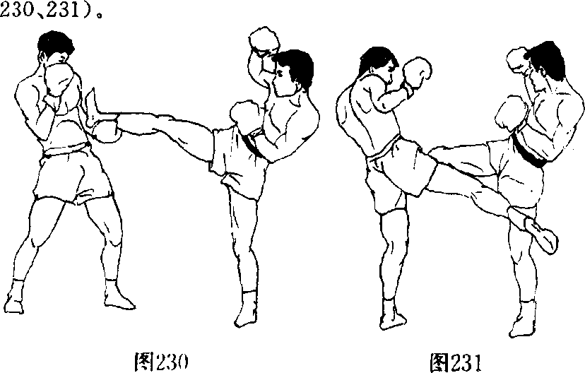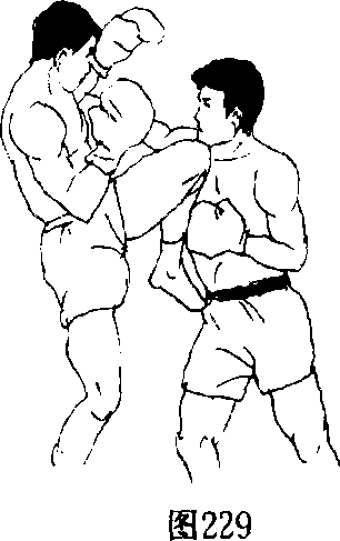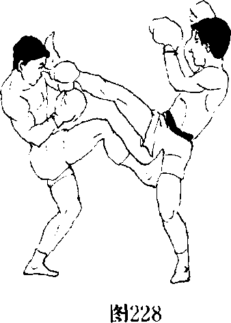 (11)对方先发刺蹬踢引诱我方注意自身下盘,随即又以 右脚高蹬腿攻击我上盘时,我即以左臂上架格开,同时用右脚 猛蹬对方支撑腿膝关节或大腿根,右脚着地时猛踏地面,身体 跃起以左跳膝撞击其胸膛、下颔(图228;229)o