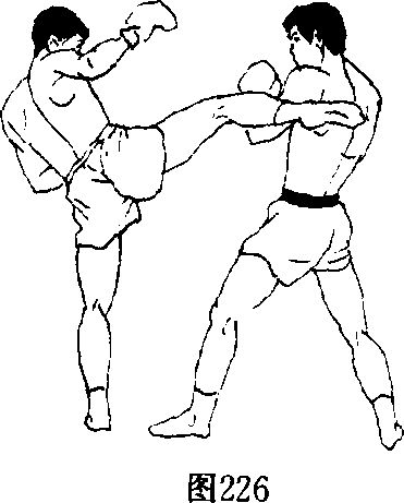 退一步躲过,随即发右脚横扫踢对方手臂或肋部,落右脚时, 继以左横撞膝攻击其心窝、腹部(图226、227)。