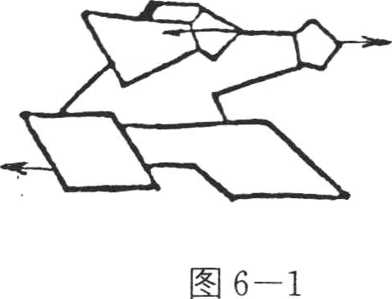 ⑥势如拉弓腿要弯 右脚向右后微撤,右拳向后拉撤于 右侧,拳心向下,高于头梢,左拳由腋下向前内旋迅猛崩出左 象鼻拳,高与肩齐,拳眼向右下(图6—1)。身体右转90。成马 步,目视左拳(图6—2) o