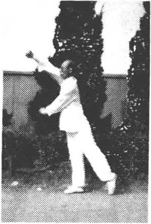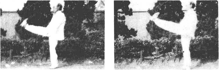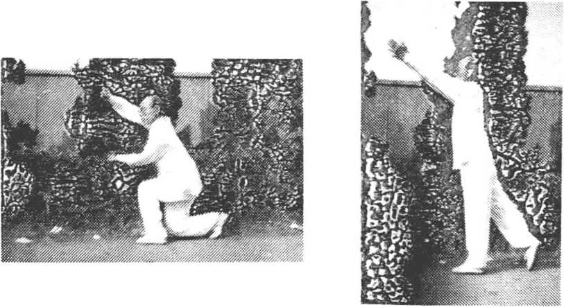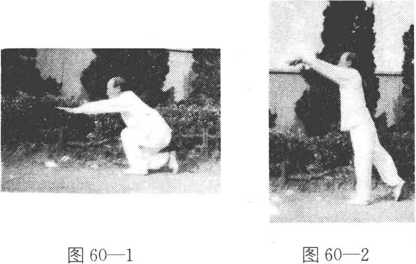 ?蜻蜓点水 双脚前移,屈膝下蹲,成右跪步。同时.双掌 内旋,向下拍击,掌心向下,掌指向前,高于膝部(图60-l)o 上动不停。身立起,成左站立步,掌背随之向上甩击,高与眉 齐,目视前方(图60—2)。