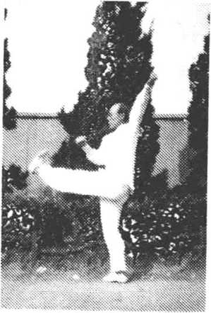 左拳由前向左上方挂击,直臂置于左肩上 方,拳背向后,拳眼斜向上;右拳外旋,以拳背向左腿上方劈 击,拳心向上,拳眼向前' 同时,左腿屈膝,足尖上勾,向前蹬 踹,高与膝平。右腿直立,支撑全身,目视前方(图57)。