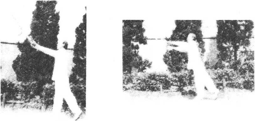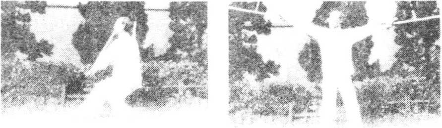 身立起,同时双手握拐角,使拐钻 左,右上起,臂微伸,拐把脱肘内旋.随右转身,拐向胸内旋转。 左拐在外,右拐在内,双拐经下(图56—1),向左、右侧甩击。 高与肩平,拐头向上。两腿分开站立,目视左方(图56—2)。