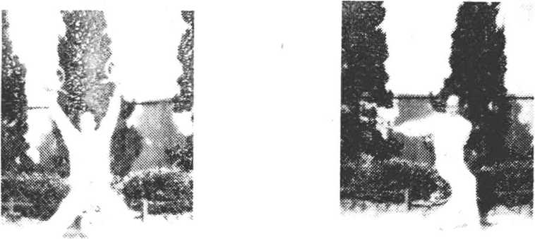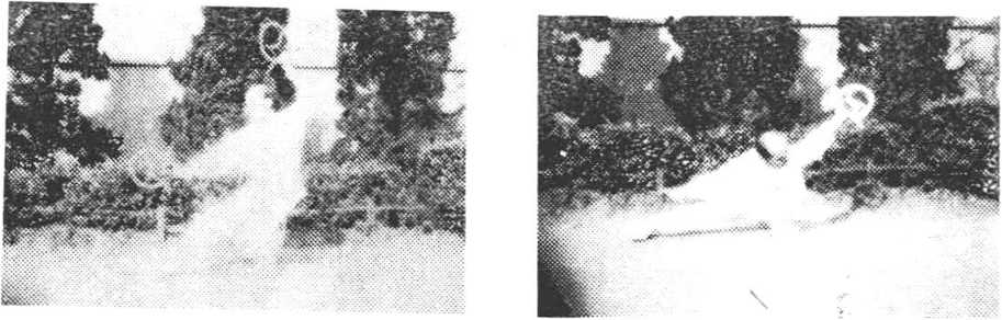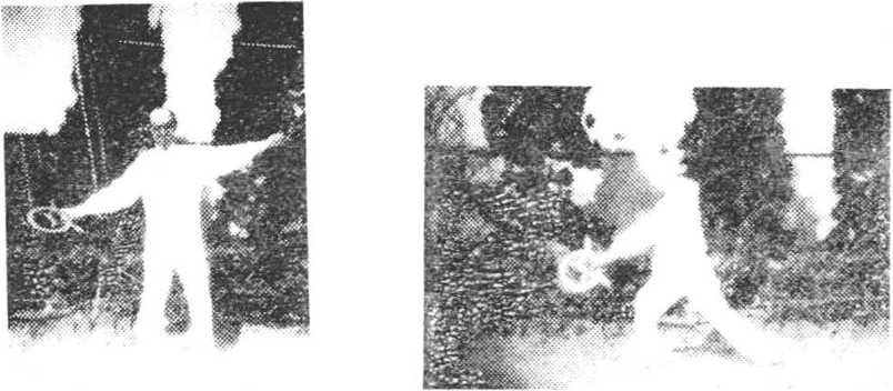 左脚向右进步,身右转 9()。,双腿屈膝下蹲,成马步。同时双手圈摆于左、右下侧,猛直 臂向头上左右摆挂。圈力向上,翅向左右。双圈在平直面上, 目视头上双圈(图43)。