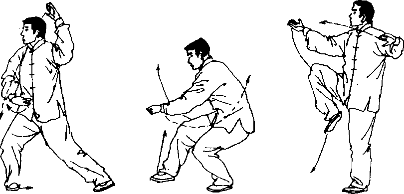 提膝托掌 左脚蹬地;左腿微屈站稳,右腿屈膝提起,脚尖
