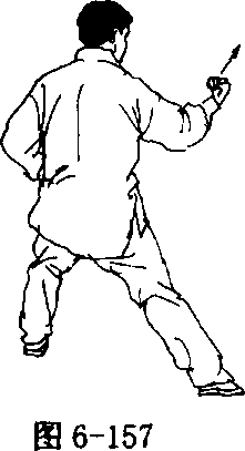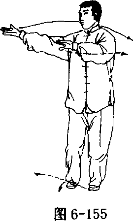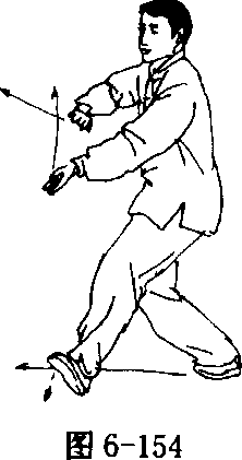 ① 摆脚旋掌 重心后移,左脚尖外撇抬起;左拳变掌,左臂 外旋,右臂内旋,两掌心同时转向外,并微向后收带;目视两掌(图 6-154)0