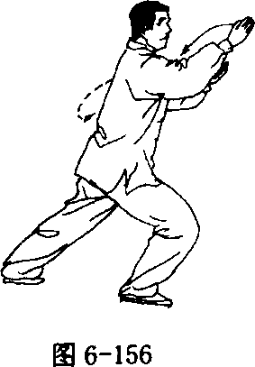 ③ 转身平捋 右脚前掌为轴,脚跟外展,身体左转,右腿屈 弓,左脚后撤一步,脚尖外展落地;两掌随转身向左平捋至体前,右 掌髙与头平,左掌置于右肘内侧,两掌心斜相对;目视右掌(图6- 156) 〇