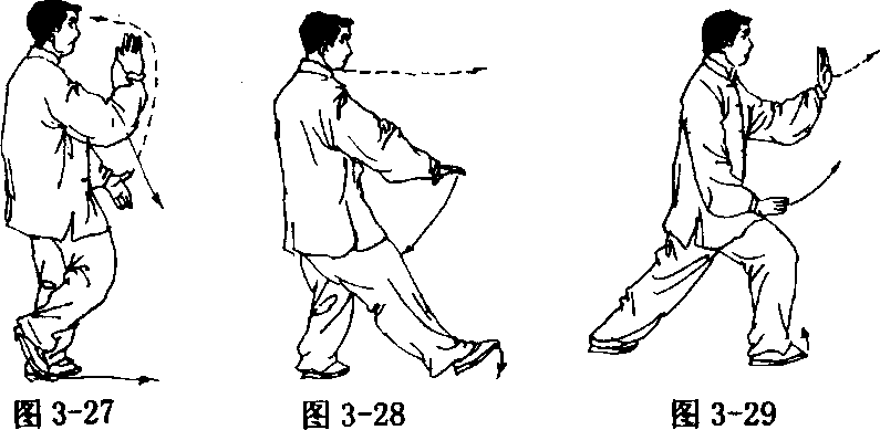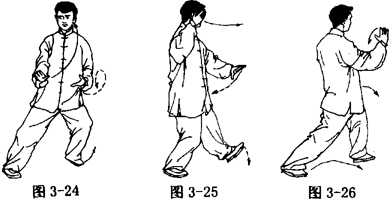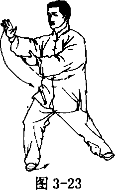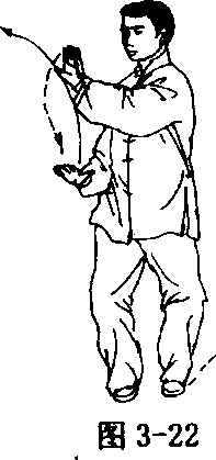 ① 转腰落掌 上体微右转,右手下落至右腰前,手心朝下; 左手向上向右划弧至脸前,手心朝前下方,眼看左手方向(图3- 22)〇