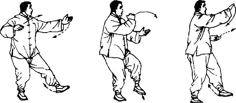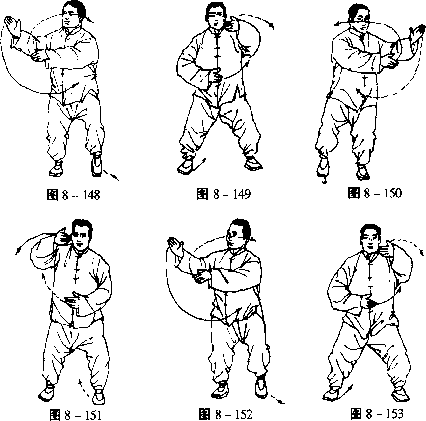② 两臂运转要随腰而动,做到自然,圆活,无论运转到任何方 位,两臂不能夹腋,也不可散开,始终保持圆满,注意手臂上劲点 的变化。