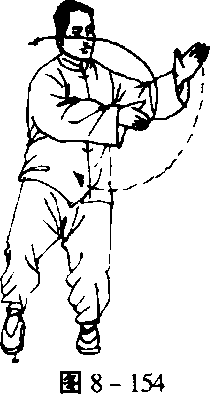 ④ 自动作3到6为一个云手,后面又有两个是重复动作,共为 3个云手。在上述倒撵猴的要点中已经提到,如果场地宽阔而要加 大运动量,将倒撵猴重复为5或7个,则云手也要从3个增为5或 7个,然后再接着做分动15,由分动15 (图8-155)再接下一拳式 “单鞭”。