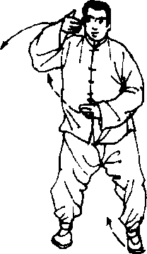 2.虚步挥掌 重心完全移于右腿,左脚提起,向里收半步