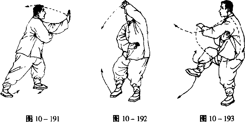 1. 扣脚转身 左脚尖内扣,上身向右后转身,右脚跟内收 并提起,成右虚步,同时,左掌随上体右转并上举,置于左额上 方,目视前方(图10-192)。