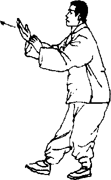 迎面推掌 左右脚以脚跟为轴一起向左扣转,屈左膝,蹬右