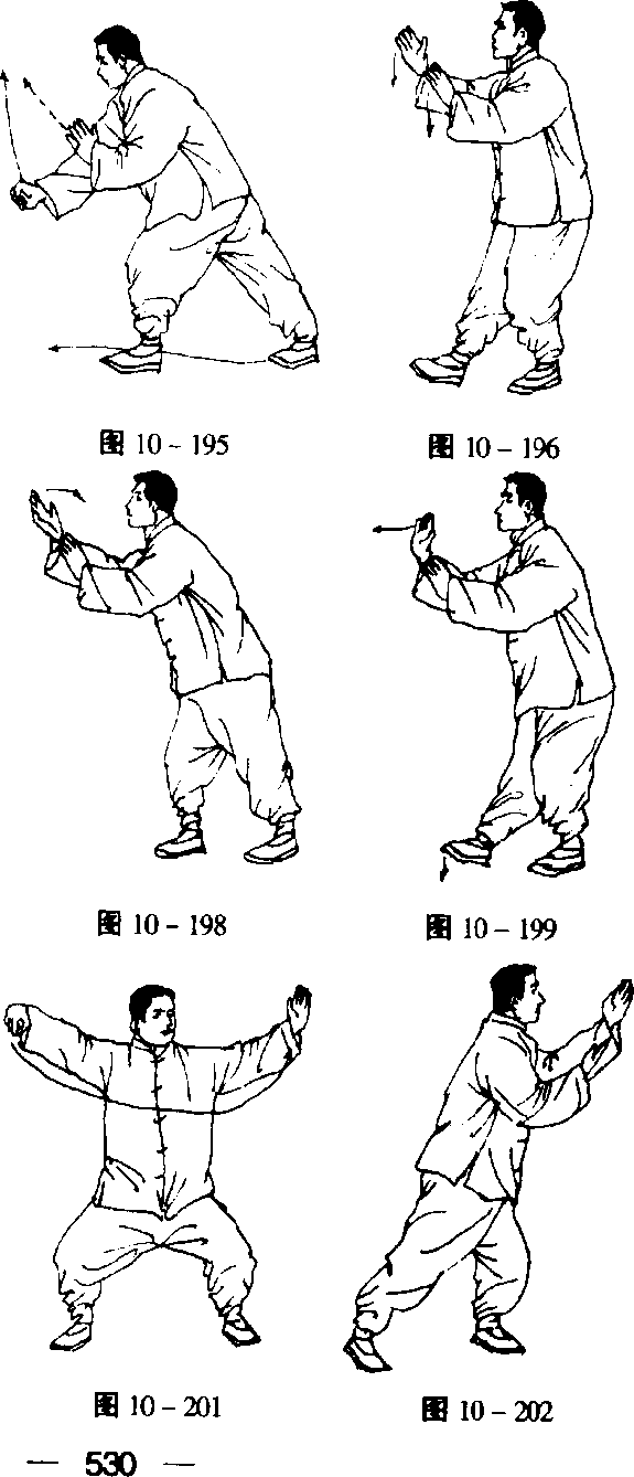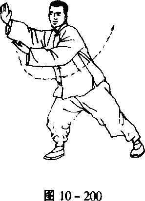 腿,成左弓步,同时,右勾变掌,由右肩侧向前弧形按于左臂下 面,左掌从右掌上面推出,目视前方(图1〇_191)。