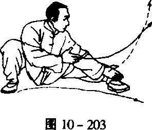 2. 摆莲拍脚 重心落于左脚,右脚提起,从左向右摆踢, 同时,左掌自上而下从左向右迎拍右脚面,右手仍在腋下,目视拍 脚(图 10-193)。