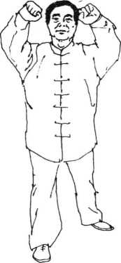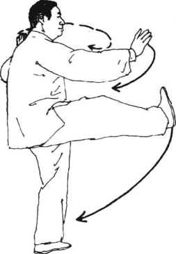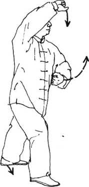 动作2 接前式身体微向左 转,重心全移至左腿,右脚提起向前 蹬出,脚尖向上,膝微屈,同时两臂 分开,掌心向外,指尖向上,目视右 掌。(图129) 【易犯弊病与纠正】与第31式相同。