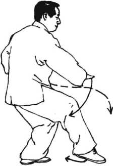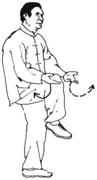 动作1右脚下落,右膝提起, 以左脚为轴,身体迅速右转45度, 向东北斜方向,同时两掌随转体划 弧下落至膝前,掌心均向上,目平 视。(图130)