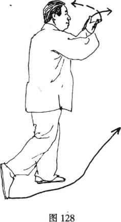 动作1身体重心渐移至左 脚,左脚尖外撇踏实,同时两臂向左 右划弧往里环抱交叉胸前,目平视。 (图 128)