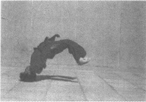 动作要点两腿并 步屈膝成半蹲,上体向 前、向下,以腰为轴;同时 以头顶部顶地,两臂以肩 两侧平分拄地,掌心朝 下;随即双脚蹬地,身体 向上、向前、向后腾空成 弧形跃起,翻转360。,双 腿蹬直并拢;翻转时,挺 胸、拔背,动作连贯协调,