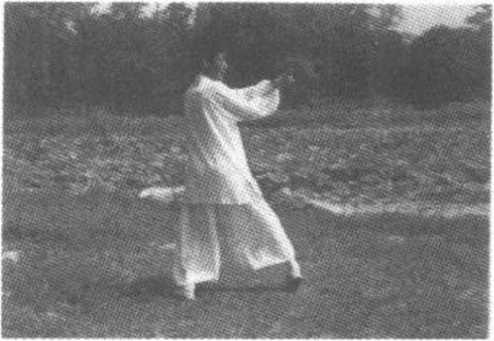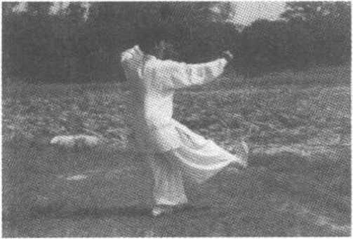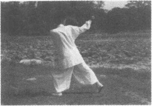臂交叉划弧形;经右腰侧再向右前上方摆动,高与肩平;同时左拳 自回收之际,从右臂前绕过,再向左前侧直臂冲拳,高与肩平。眼 随拳行。以上两臂前后、上下翻转动作,连续重复三次(图3-1-5)o