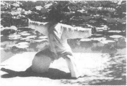 两手同时变拳。右 腿屈膝站立,左腿屈膝提 起,撤步于右小腿后侧成 半蹲,脚掌外展,脚心斜 朝上。动作与第一趟提 膝虎抱势(图3-1-22)相 同(图 3-5-25)o