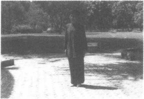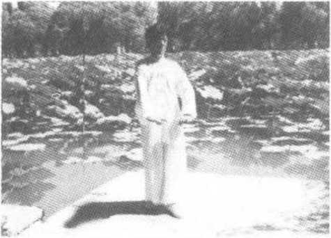 上、再向下划弧形,使两手同时按于腹前,两手相对,两手手心朝 To与此同时,左脚向后撤步,回收至右脚内侧中间,成十字丁步 立正姿势,左脚跟上跷;目视前方(图3-5-27)o
