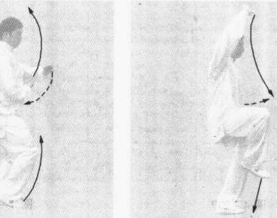 右手向上穿掌时要注意,右手要贴身体向上。身体要随右手 外展时稍向右转。右膝上提时,裆劲应继续向下塌劲。