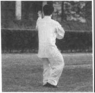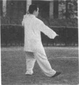 【教学要点】此势从后坐翘脚过渡而来,与野马分鬃的连续 进步相同,教学中要注意右脚上步时应有蹬碾之劲,收右胯根依