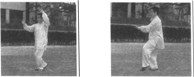 (1) 后坐提手:重心移至左腿,右脚向前跟进半步,身体重 心再移至右腿,左脚稍向前移,脚尖点地,成左虚步;同时两手 放松并划弧下落,上体微向右,右手上提至肩上耳旁,左手下按 体前;目视前方(见图4-154、4-155)。