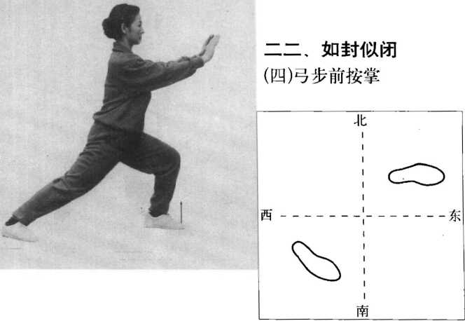 重心前移,左腿屈膝前弓,右腿自然伸直,成左弓步。同时两 掌向上向前推出,腕部与肩平,手心向前,指尖向上。目视前方。