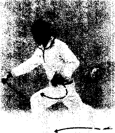 左脚向左前方(西南)迈出一步,脚跟着地,上体向右 拧转。同时两手向怀中掩裹下落,合抱于右腰前,右拳落于 左掌心,两手均转向上。眼看前下方。(图181)