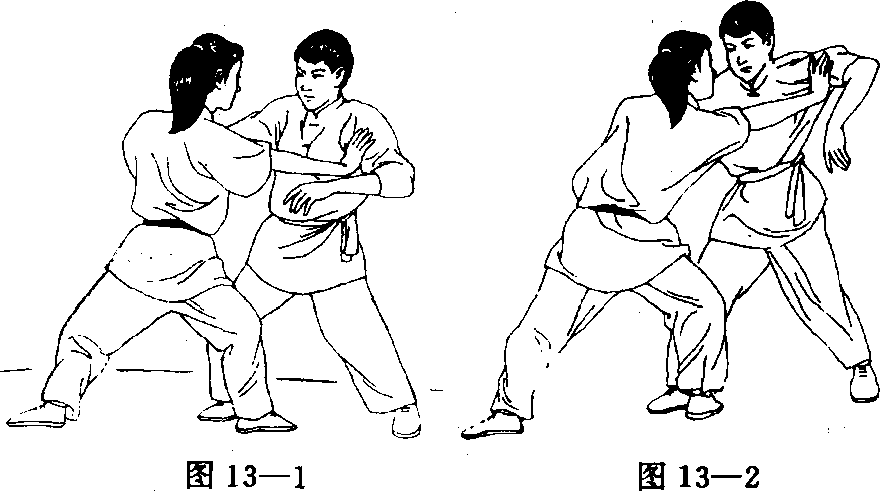 2. 王建华伸右臂,右掌大力推张红梅左上臂。张红梅与 之顶抗。(图13—2)