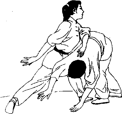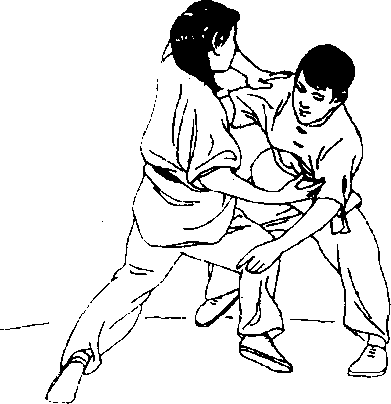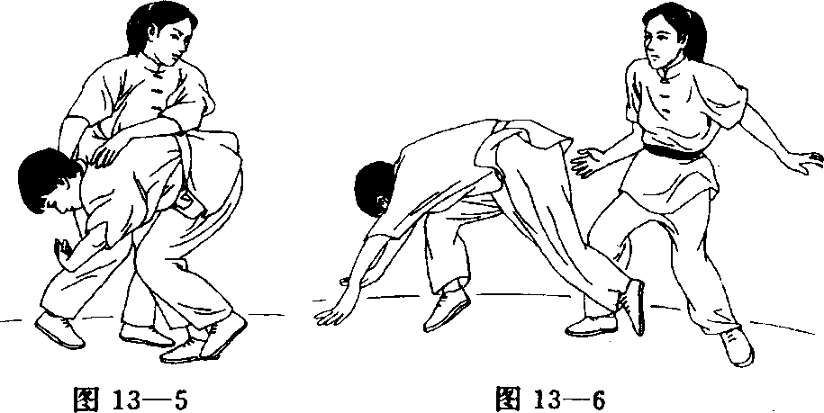 3?王建华突然松开右手,使张红梅落空。同时,王左手按 张右肩,使张向左侧倒伏。(图13—3)